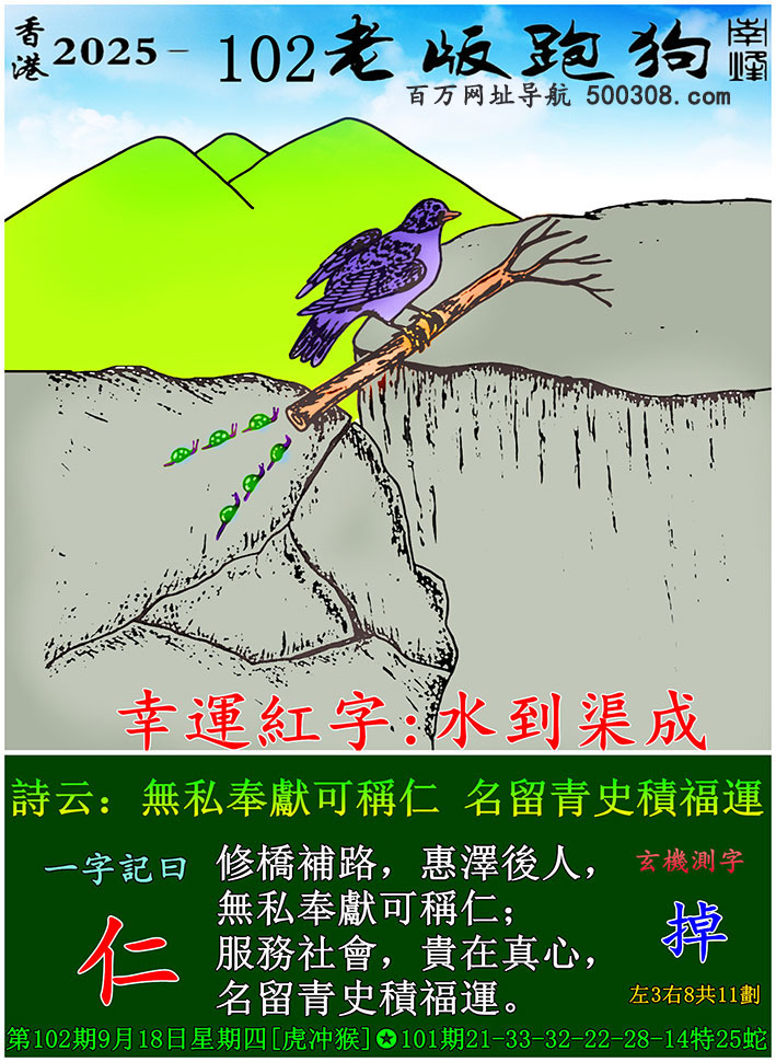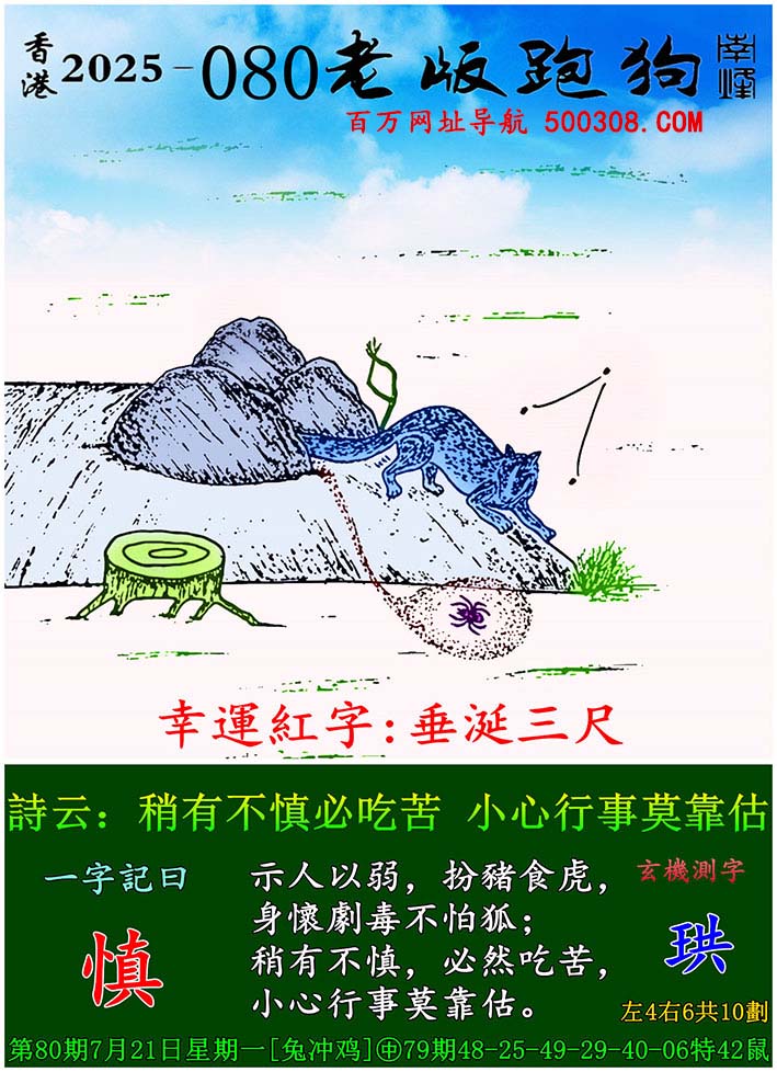 102期跑狗图:一字記之曰: 【骰】 股子顯數,輸贏已出。 千金家產,今已耗幹。玄機測字:《澳》 一語中特:四方八面