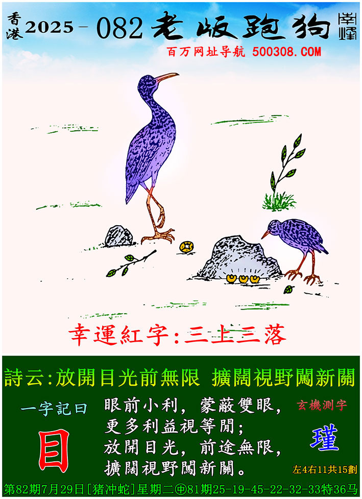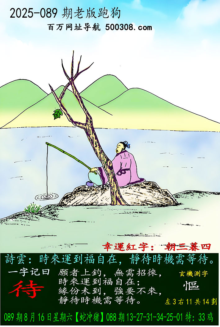106期跑狗图:一字記之曰: 【覓】 碧波退盡,魚困淺灘。 靜待遊鱗,覓跡求食。玄機測字:《綸》 一語中特:五光十色