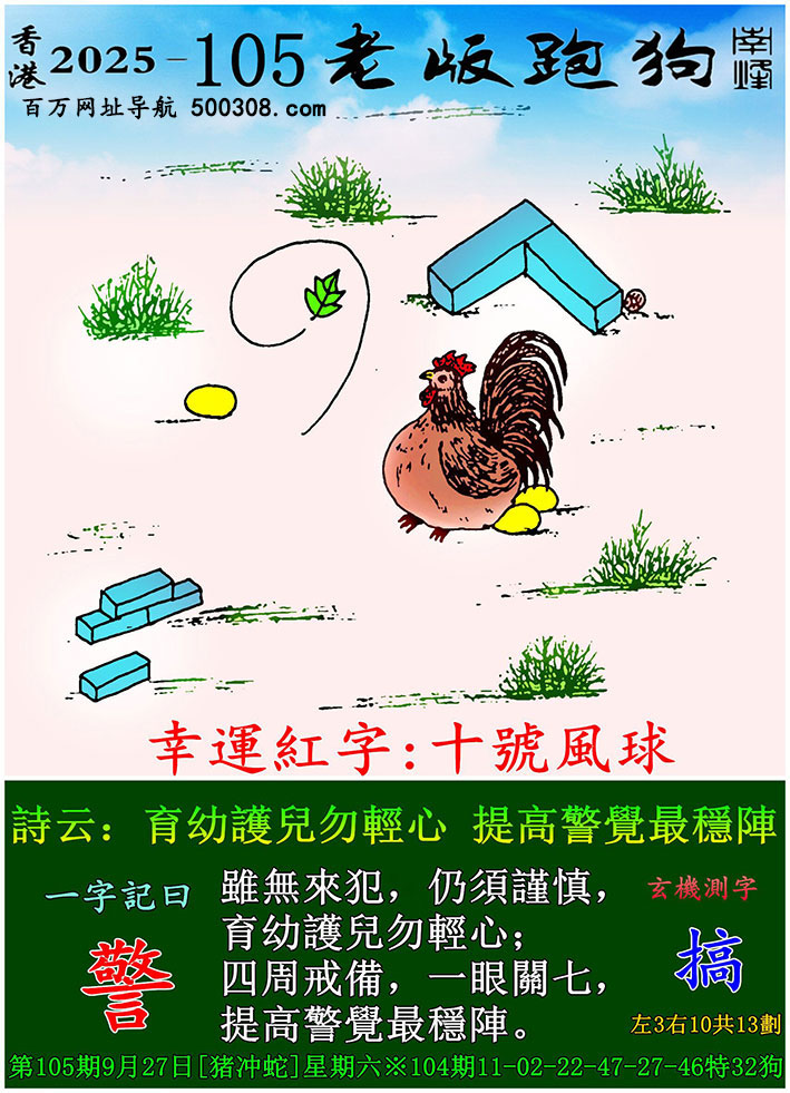 105期跑狗图:一字記之曰: 【箭】 蟲垂四野,人立石邊。 騰光箭氣,正中靶心。玄機測字:《楊》 一語中特:三頭六臂
